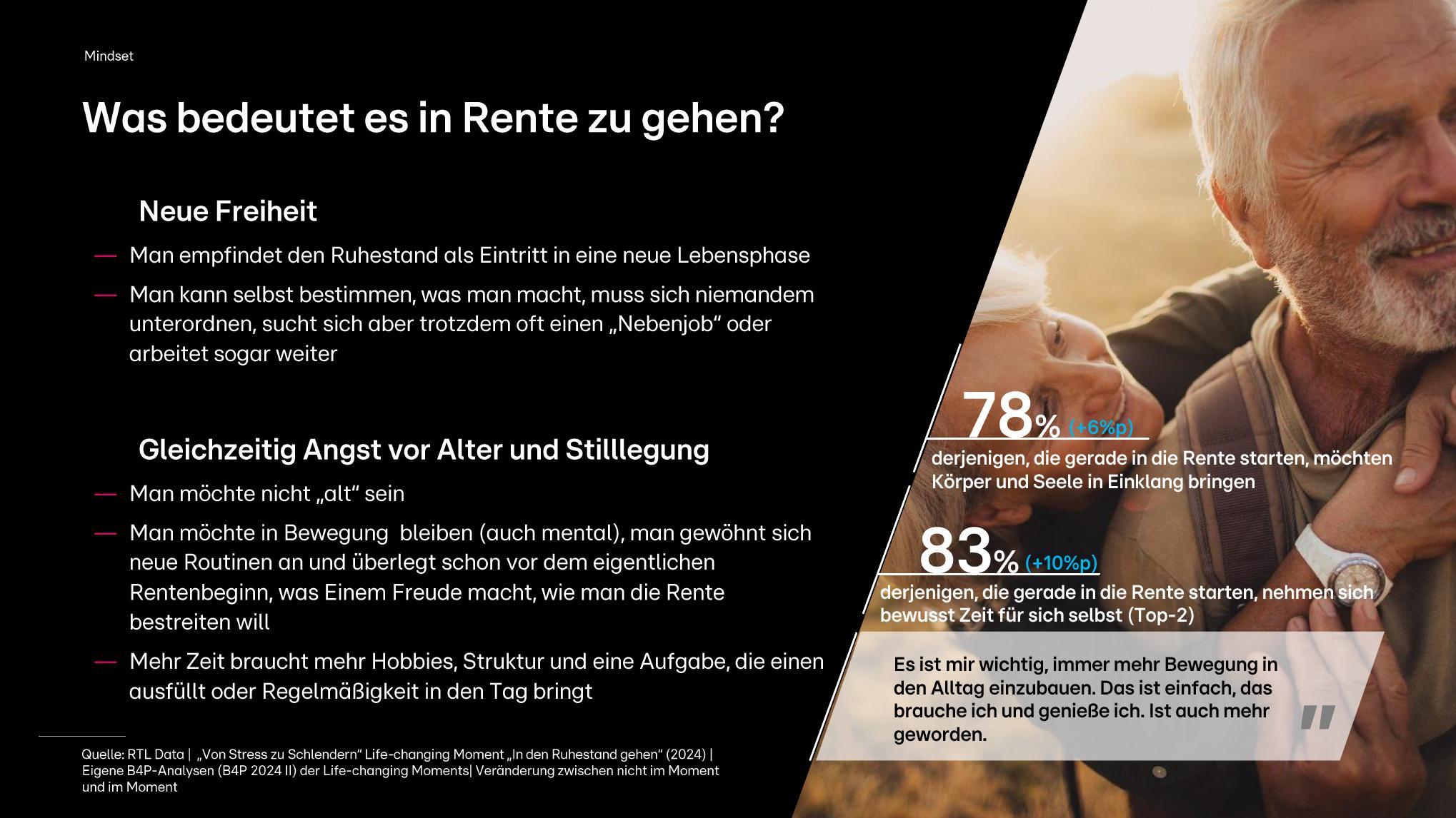 Die Zahl der Menschen im Alter von 57 bis 65 Jahren, die sich im Ruhestand befinden oder kurz davorstehen, wächst exponentiell. Ein Potenzial von 3,59 Millionen Personen für die es heißt "Goodbye Karriere" und "Hello neue Freiheit!". Diese Generation geht nicht einfach in "Rente", sie geht auf Reisen, in die Natur, auf den Wochenmarkt. Sie kochen, streamen, gamen, sporteln – und das bewusster als je zuvor. 83 Prozent sagen, dass sie sich bewusst Zeit für sich selbst nehmen möchten – ein Plus von 10 Prozentpunkten gegenüber denen, die noch im Job sind -, 81 Prozent wollen für Neues offenbleiben.