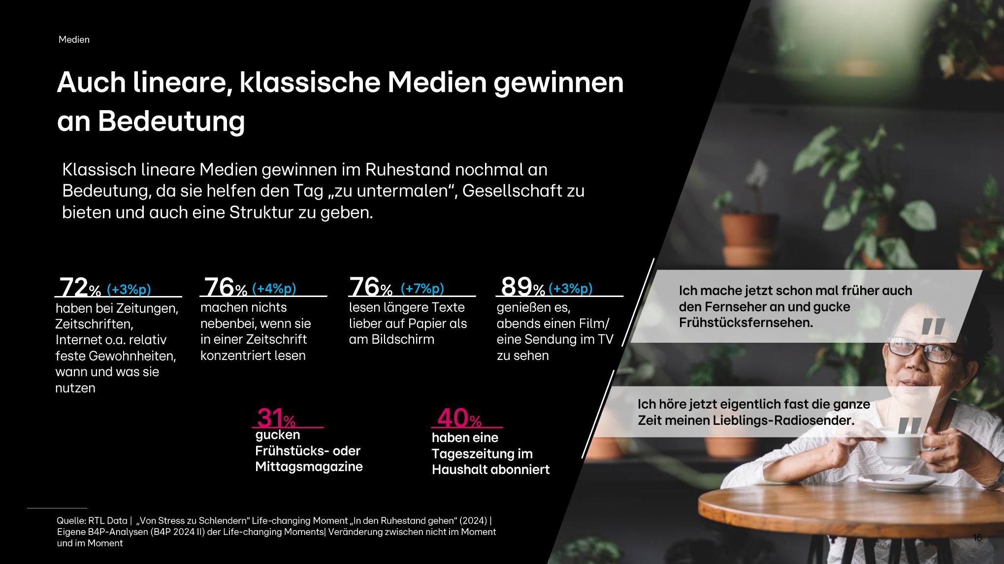 Neu-Rentner:innen wollen flexibel und agil bleiben und lassen sich unter keinen Umständen abhängen. Nachrichten, Austausch mit anderen Menschen – man sucht aktiv den Input von außen, probiert neue Dinge aus und bleibt auf dem Laufenden. Deutlich zeigt sich das in der Mediennutzung, die sich radikal verändert, ohne das Bewährte loszulassen. Digitales gehört selbstverständlich zum Alltag: 97 Prozent nutzen ein Smartphone, 86 Prozent surfen mobil im Internet, bei 58 Prozent ist Social Media (+13%P) angekommen und Streaming boomt mit 75 Prozent. Klassische Medien bestimmen die Tagesroutine und vermitteln ein Zugehörigkeitsgefühl. 40 Prozent haben eine Tageszeitung abonniert, 89 Prozent genießen abends TV, und 76 Prozent lesen längere Texte lieber auf Papier als digital. Nachrichten sind der Tagesanker: 81 Prozent schauen gerne Nachrichtensendungen im TV und 69 Prozent informieren sich mehrmals täglich.