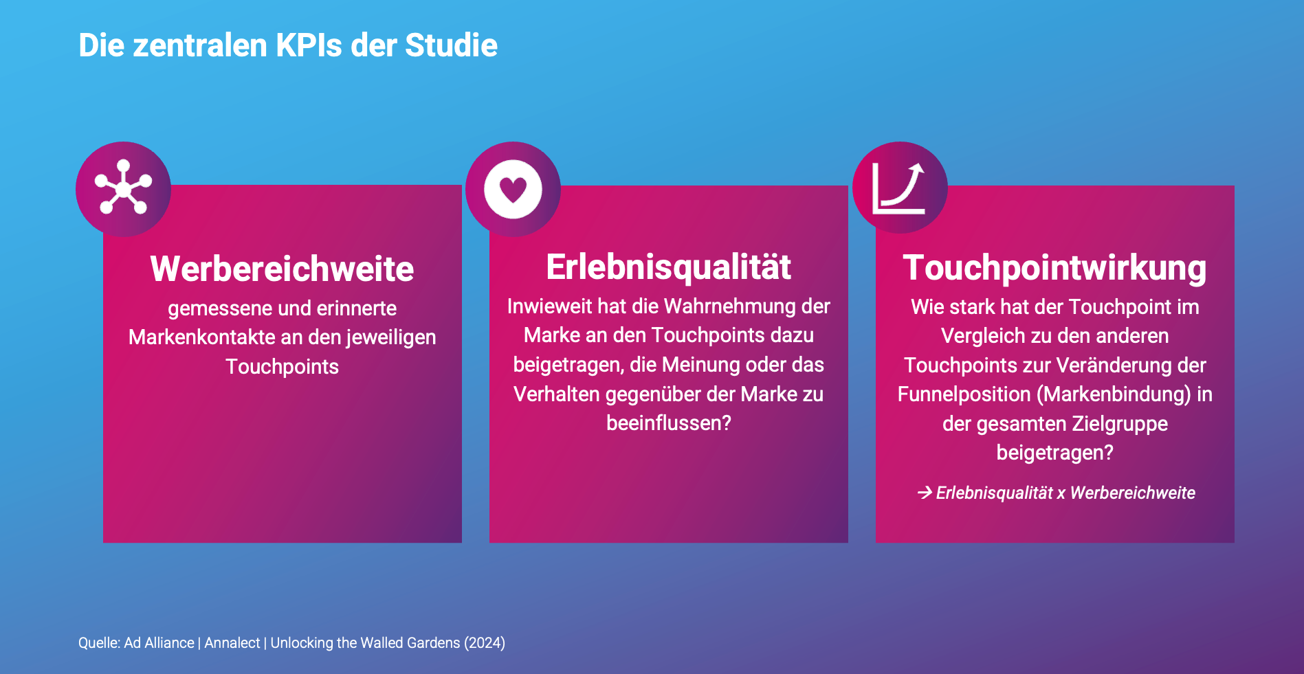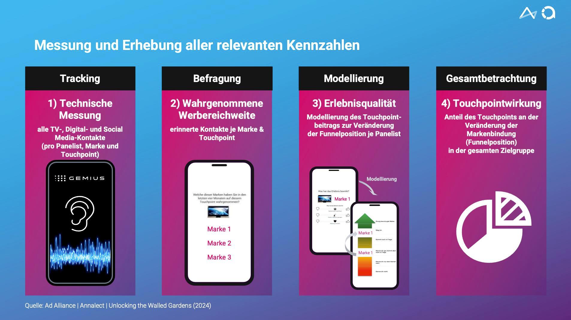 Für die Studie wurden die Werbekontakte von TV und allen digitalen Kanälen mit einer vergleichbaren Methodik screenübergreifend technisch gemessen. Für den vollumfänglichen Mediavergleich werden in einer nachfolgenden Befragung diverse Werbewirkungsparameter und zusätzlich die wahrgenommene Reichweite von allen relevanten Markentouchpoints erfragt. Damit lassen sich auch Markenkontakte berücksichtigen, die nicht gemessen werden können. Im nächsten Schritt wird über ein anspruchsvolles Analyseverfahren berechnet, in welchem Ausmaß die unterschiedlichen Kontaktpunkte auf Markenbindung einzahlen. Die mehrstufige Vorgehensweise liefert insgesamt ein umfassenderes Verständnis der komplexen Wirkungszusammenhänge und Erkenntnisse darüber, wie die unterschiedlichen Touchpoints wahrgenommen und erlebt werden und wie bzw. an welcher Position im Markenfunnel sie wirken.