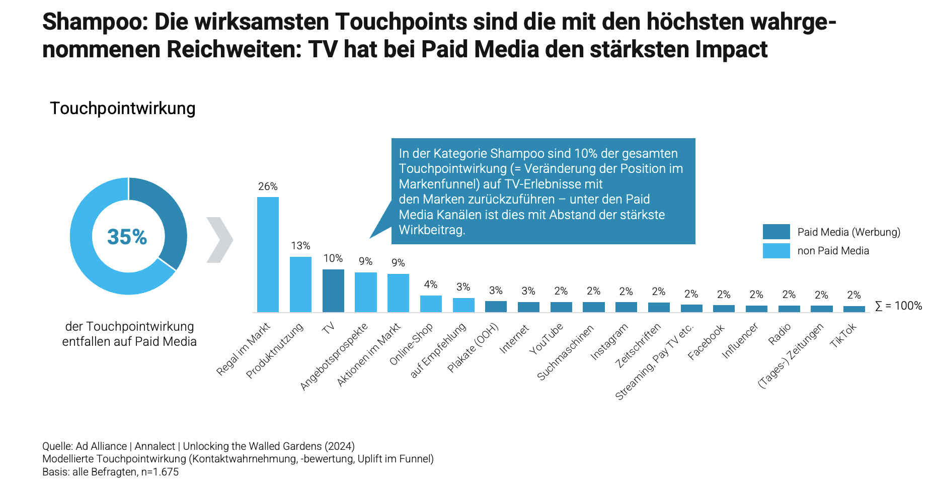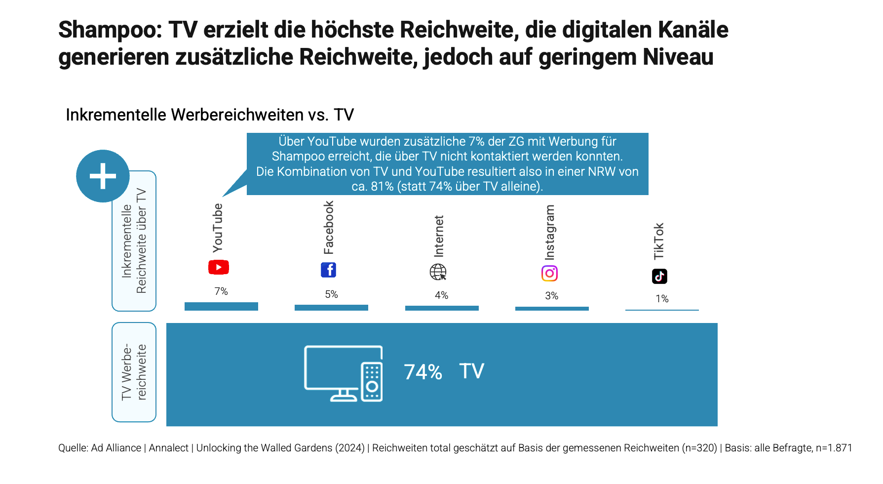 Exemplarisch wurde für die Branchen Lebensmitteleinzelhandel (LEH) und Shampoo untersucht, was bei TV, Digital, YouTube, Facebook, Instagram und TikTok den Unterschied macht. Die Kombination von Reichweite und hoher Wirkkraft (Erlebnisqualität) entscheidet darüber, wie effektiv die verschiedenen Marketing-Touchpoints für eine Marke arbeiten.