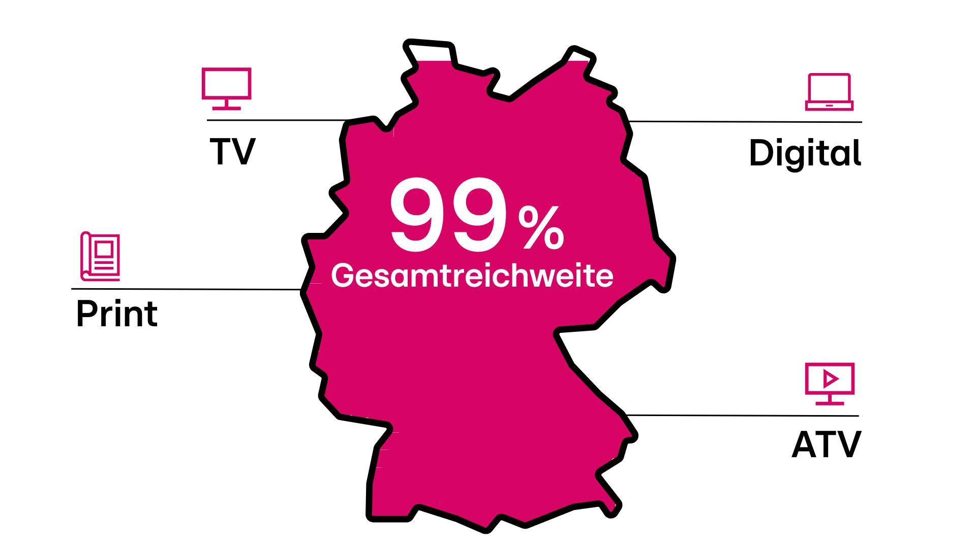 Ohne Reichweite geht es nicht. Eigentlich eine Binse - dem haben wir nichts hinzuzufügen. Denn glücklicherweise macht uns beim Thema Reichweite in ganz Deutschland niemand etwas vor. Haben Sie schon von diesen 99% gehört? Das ist unsere monatliche Nettoabdeckung – eine schöne Ausgangsbasis, um Botschaften an Ihre Konsument:innen zu bringen.